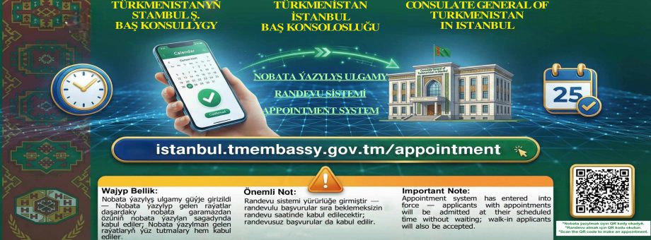 Генеральное консульство Туркменистана в Стамбуле сообщило в социальных сетях о вводе в действие новой системы записи на приём. Нововведение направлено на повышение качества обслуживания граждан и оптимизацию работы консульского отдела.