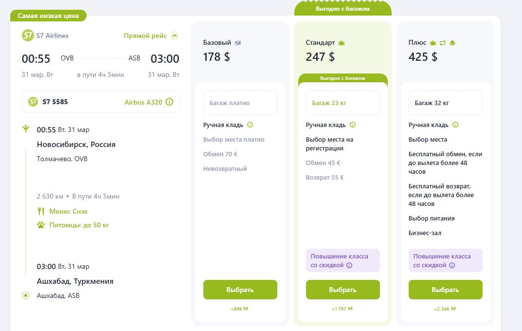 Пассажирам доступны различные тарифные опции, включая возможность провоза багажа, выбор места и повышение класса обслуживания.